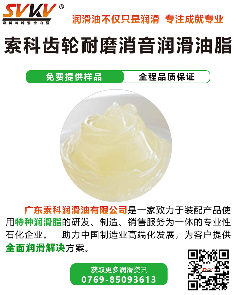 廣東索科潤滑油有限公司是一家致力于裝配產(chǎn)品使用特種潤滑脂的研發(fā)、生產(chǎn)、定制、服務為一體的專業(yè)性石化企業(yè)。致力為制造業(yè)客戶,提供專業(yè)的選油方案,協(xié)助客戶解決產(chǎn)品裝配時的潤滑難題,還可根據(jù)客戶特殊需求訂做適合的潤滑油品。有效提高產(chǎn)品性能、減低維護成本,索科助力制造業(yè)高端化發(fā)展!