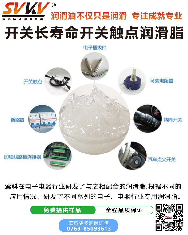 索科SVKV長壽命開關(guān)觸點潤滑脂廣泛用于汽車、家電、玩具等開關(guān),主要有微動開關(guān)、柱式開關(guān)、滑動開關(guān)、旋轉(zhuǎn)開關(guān)、彈片、觸點、簧壓搖桿開關(guān)或壓按式開關(guān),有效減少電弧和降低磨損的特性使其操作順暢、觸感優(yōu)異且提高開關(guān)導(dǎo)電性能,使用產(chǎn)品壽命更長。