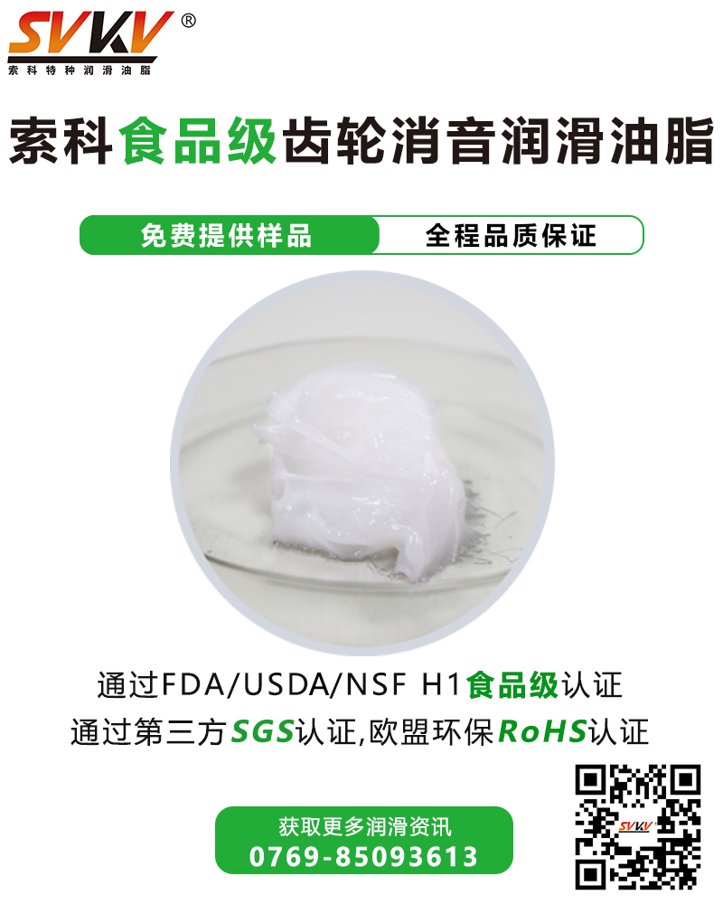 索科SVKV食品級齒輪消音潤滑油脂選用食品級的基礎(chǔ)油和無毒無害的添加劑精制而成,專為食品加工及醫(yī)療設(shè)備而研制。索科SVKV食品級齒輪消音潤滑油脂符合美國FDA和USDA的法規(guī)和標準,并通過美國NSF H-1食品級認證,確保食品設(shè)備的衛(wèi)生、安全。